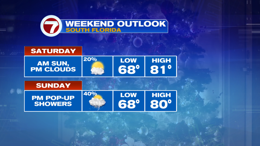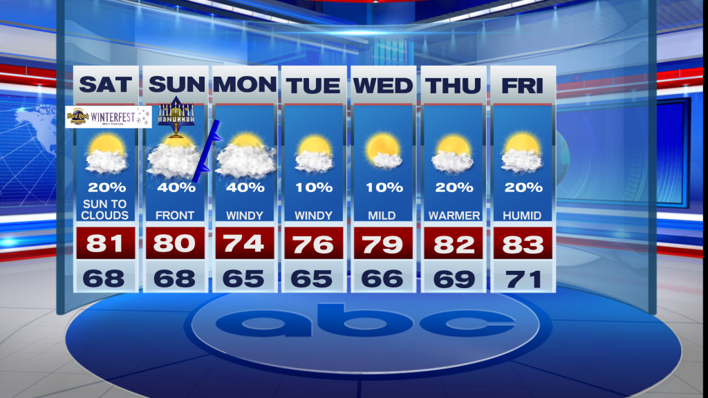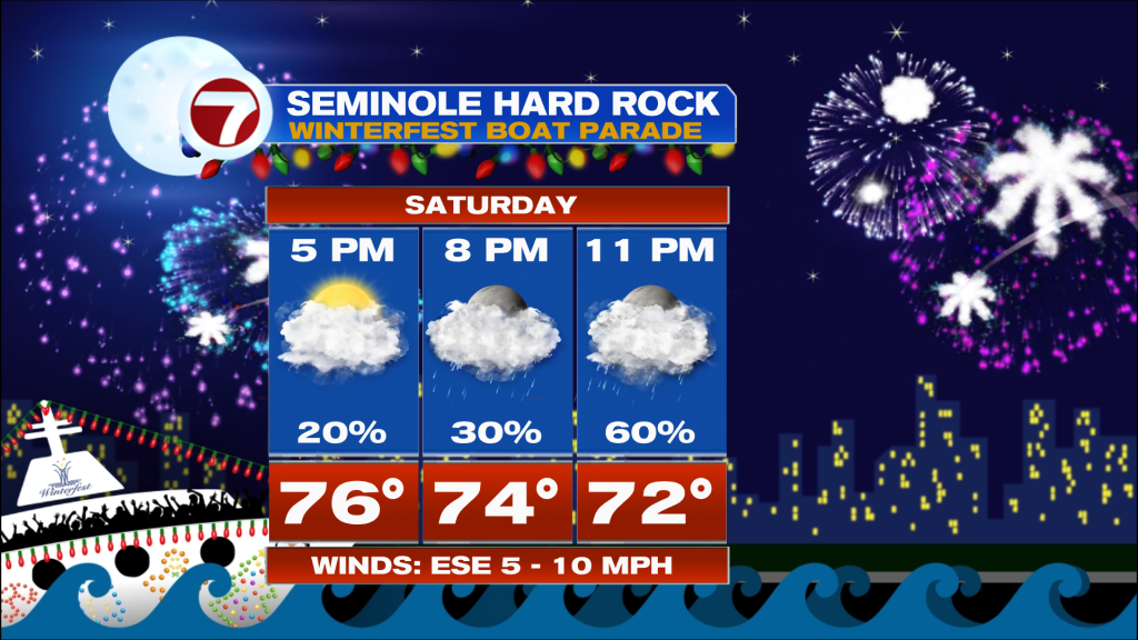 As for today, we’ll see increasing clouds but for the most part stay dry with highs in the lower 80s. A few showers are possible south, but the rain should hold off for the most part until later tonight further north. This is good news because the Seminole Hard Rock Boat Parade is tonight. Taking a closer look at the forecast, expect increasing clouds with a chance of a shower after 6PM, and temperatures in the 70s. The bulk of the rain should hold off until after the parade is over.