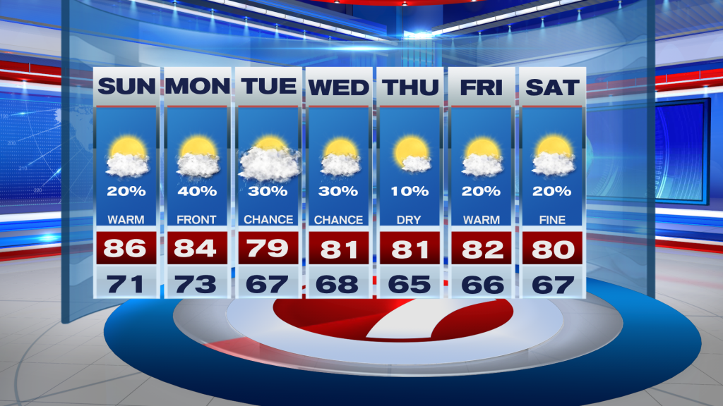 For highs, Tuesday will be the mildest with highs in the upper 70s. Then the rest of the week will be a bit warmer into the low 80s.