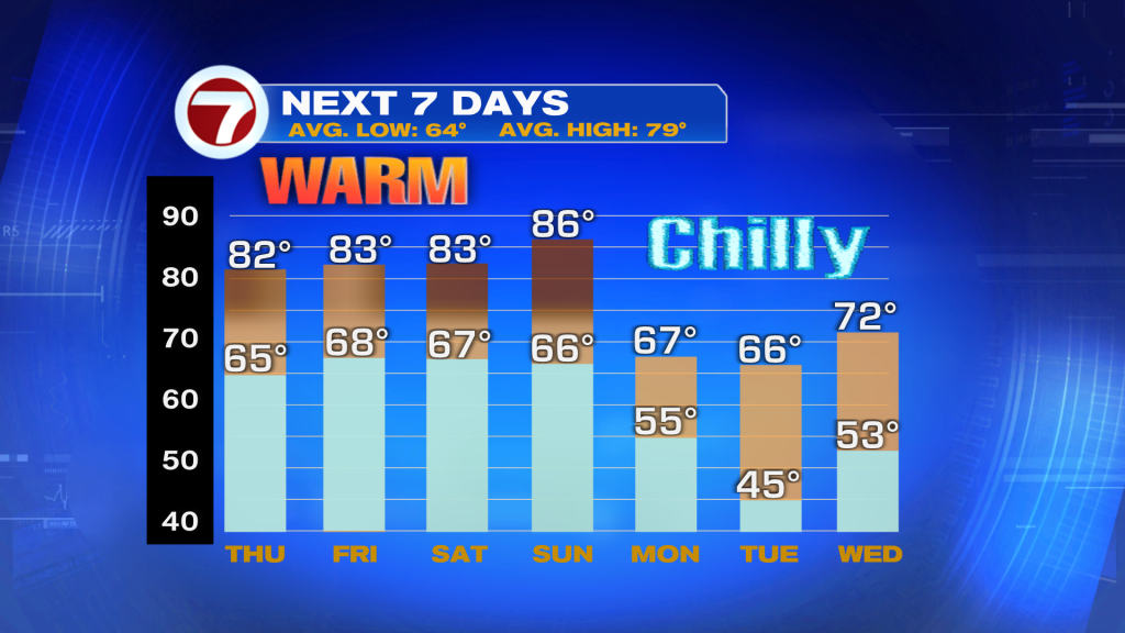 A much cooler and breezy pattern settles in early next week. Highs Monday and Tuesday may struggle to reach 70 degrees, and overnight lows could dip into the 40”s. It’s a noticeable temperature swing from the summer-like warmth we’ll feel heading into the weekend.